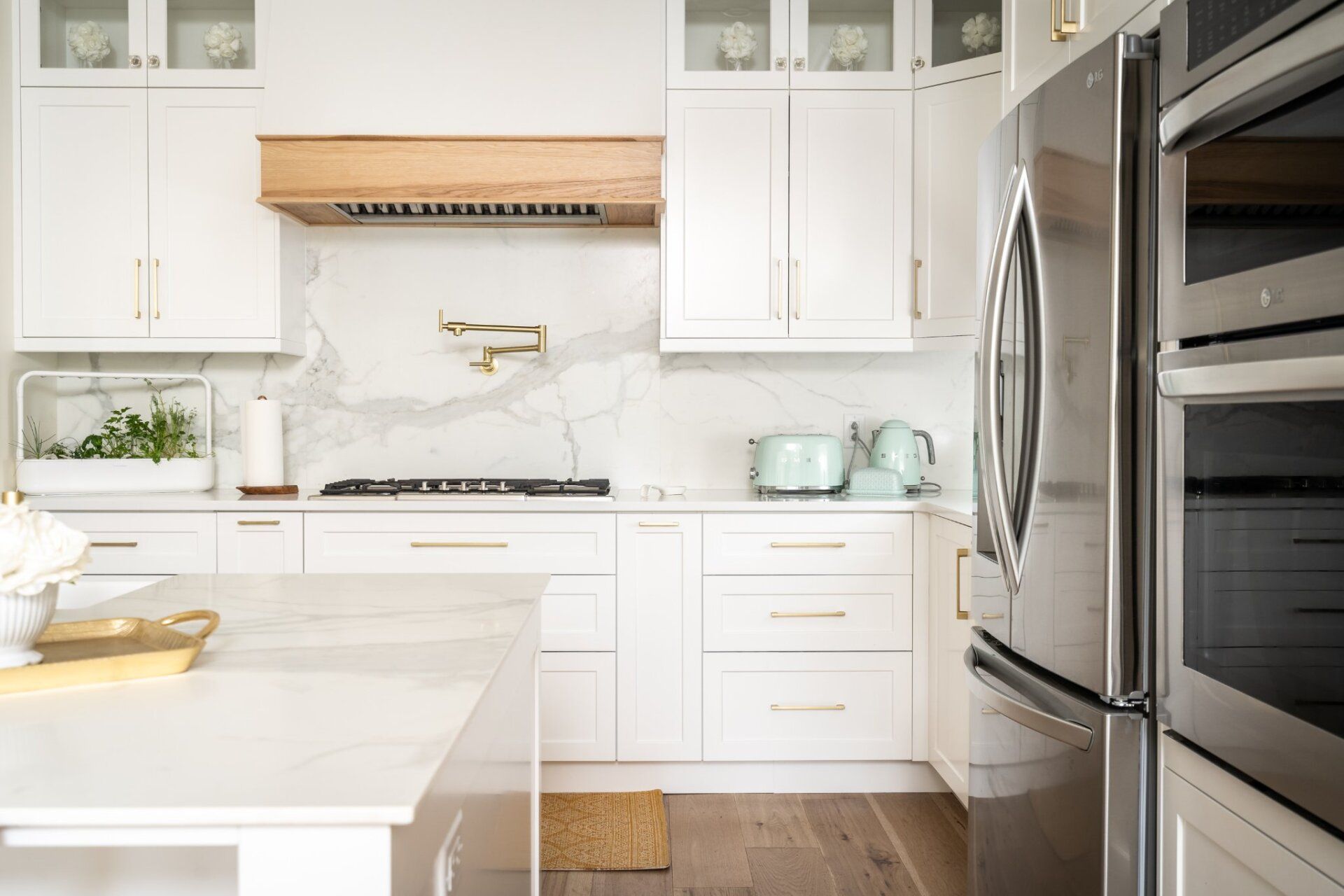 OVERVIEW: Painted Benjamin Moore OC-117 Simply White with natural hickory accents. @DSF Granite & Tile installed quartz countertops in Hanstone – Bianco Canvas (3CM) on the perimeter, island top and full height backsplash in Sapienstone Porcelain – White Calacatta (Silky Finish, 1.2CM) as well as a Bristol – Fireclay, apron undermount sink.